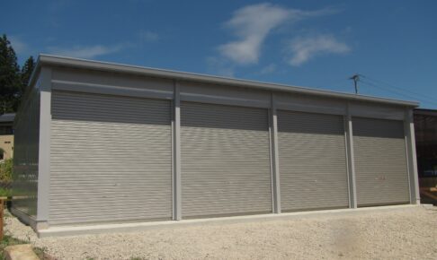 【組立完了】 本体:「イナバ倉庫」SGN-386GUN-3(多雪型) オプション:リモコンシャッター・シャッターケース・下屋 工事内容:本体組立・オプション取付